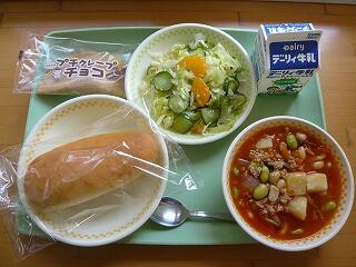 ミニチーズパン ポークビーンズ みかんサラダ チョコクレープ 牛乳