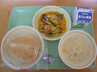 マヨネーズパン クリームポタージュ えびと小松菜のソテー 牛乳