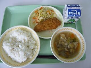 麦ご飯 かき玉汁 県産キャベツのカレーメンチカツ 添え野菜 牛乳