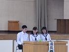 「私は、2年生になってしたいことが大きく2つあります。まずは勉強です。2年生になると1年生の時よりも、もっと難しくなります。特に数学と英語は、1年生の時の内容をよく理解しておかないとついていけません。私は、一番理科が苦手なので「復習を毎日やる」という目標をつくったので頑張りたいです。2つ目は部活動です。2年生になると、新しく後輩がたくさん入ってきます。私たちがお手本を見せないといけません。自分たちが悪いことをしていたら、きっと1年生は嫌な気持ちになると思います。だから、自分たちの部活動が楽しいと思えるようにしていきたいです。最後に。2年1組が笑顔でいっぱいになるように男女問わず協力していきたいなと思います。」