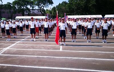 本日は予行練習を行いました。昨日の雨でグラウンド条件は最高で、土埃も全くありませんでした。ただ昨日が涼しかっただけに、今日の日差しは一段と暑く感じました。まだ数日間の練習ですが、生徒は暑い中よくがんばりました。生徒テントにミストを取り付けました。午前中は快調でしたが、昼近くになって外れてしまいました。ホースをはずしてみると、中の水はお湯になっていて、このためホースが膨らんだようです。明後日までには再度調整したいと思います。明日は体を休めて、金曜日以降に備えてほしいと思います。