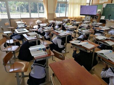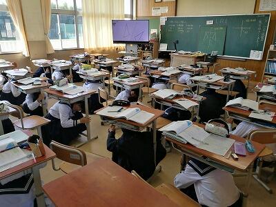 今日は県内で県民一斉防災行動訓練「みやざきシェイクアウト」が実施されました。これは 「津波防災の日」及び「世界津波の日」を中心とした期間に、地震発生時の安全確保行動を県内全域で行う防災訓練です。 大規模地震の発生時には、まず自らの身は自らで守るという「自助」の考え方に基づいて「いのち」を守ることが大切で、 「どこでも、誰でも参加できる訓練」ということで、本校では午前10時に放送で緊急地震速報を流し、机の下にもぐる訓練をしました。シェイクアウトの説明以外はしてありませんでしたので、授業中の急な放送に生徒は驚いたようですが、ほとんどの生徒がすぐに机の下に入り、両手で机の脚をしっかりつかんでいました。 南海トラフ地震が将来的に心配される中、いつ、どこで、地震に遭遇するかわかりませんので、年間を通してこのような訓練をしていくことが大切だと感じました。下の写真は1年1組の様子です。