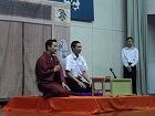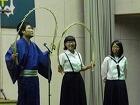 始めに笑福亭呂好さんから高座や座布団、名びらなど演芸に用いる用具の説明と「こばなし」の説明があり、生徒代表の原真太郎くんと岩切翔聖くんが指導を受けながら「こばなし」披露しました。次に桂治門さんが「南京玉すだれ」の芸を披露した後、代表の原田綺良璃さんと宮本日溫さんに演技指導をしてくださいました。生徒たちは初めてとは思えないくらい上手に演じることができました。次に笑福亭呂好さんが落語「動物園」を桂 治門さんが落語「ひらばやし」を演じてくださいました。最後に生徒代表の学習委員長の日髙さんが「初めて落語を生で聞きました。話に引っ込まれていき楽しかったです」とお礼を述べて鑑賞教室を終了しました。生徒たちは芸に親しんでいたようです。たくさんの拍手が自然と出ていました。
