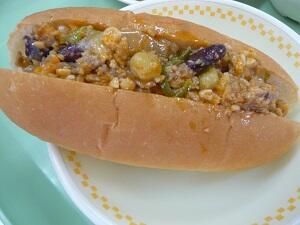 チリドッグは、ホットドッグにチリコンカンなどのミートソースをかけたものの総称で、アメリカでは一般的に食べられています。ギリシャやマケドニアからの移民から伝わったのが始まりだそうです。今日の給食は、背割りパンにチリドッグの具をはさんで食べるセルフサンドです。