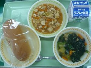 今日の給食は「世界の料理」献立です。大きいおかずは「ロクロ」というアルゼンチン料理で、肉、かぼちゃや芋、とうもろこし、豆類などを入れて煮込むスープです。たまねぎやじゃがいもを入れることもあるそうです。給食では、にんじんやほうれん草、さつまいも、コーンの他に、ひよこ豆、えんどう豆、赤いんげん豆を使っています。たくさんの食材が使われている、栄養たっぷりのスープです。