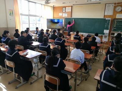 「正義を求めて」と言う主題で、「正義って何?」という資料をもとに、みんなで正義について考える授業でした。登場人物の自分が正しいという主張に対して、自分の考えをほとんどの生徒が発表しました。自分の考えや思いだけを主張するだけではなく、相手の立場や思いを尊重するなどの心配りや気配りの大切さを学んだ授業となりました。
