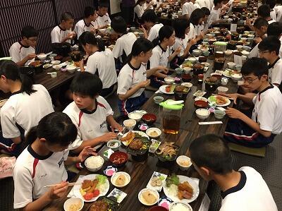 2年生の修学旅行と1年生の宿泊体験学習の様子を随時お知らせいたします。下の写真は2年生、昨夜の夕食の様子です。