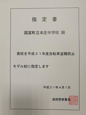 昨年度に引き続きまして、本年度も高岡警察署から「自転車盗難防止モデル校」に指定していただきました。