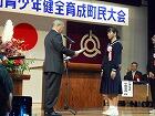 また、町民大会では町こども育成連絡協議会の活動事例発表が行われ、ジュニアリーダーとして活動している瀬尾宙大くん(3年)、管友喜乃さん(2年)の紹介もありました。本校生徒がいろんなところで活躍しています。これからも頑張ってください。