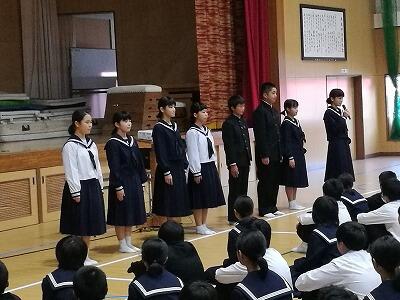 この後、専門委員会や執行部の目標や具体策の説明がありました。新しい生徒会の組織になって初めての生徒集会ですが、みんな堂々と発表してその意気込みが伝わってきました。