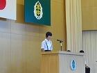 今日は、1学期の終業の日で、4時間目に終業式を行いました。終業式では、各学年の代表生徒が、1学期の反省を発表しました。1年生代表の後藤優太くんは、「楽しい1学期でした。立ち止まってのあいさつ、真剣な学習ができました。」と1学期を振り返りました。2年生代表の楠木梨里さんは「委員長として、修学旅行実行委員長としてと苦手を克服できました。」と1学期を振り返りました。3年生代表の「挑戦すること」をテーマに、委員長・部活動・勉強を通して1学期を振り返りました。3人の代表は2学期への目標まで紹介してくれました。生徒たちは暑い体育館でしたが、一生懸命に聞いていました。とても立派な聞く態度でした。全校集会のあと、今月29日で勤務の終わられる栄養職員の島屋敷倫子先生にご挨拶をいただきました。島屋敷先生は「次に出会うときは、バランスのとれた食事をしっかりとって大きく成長した皆さんを見せてください」と生徒たちにお話しくださいました。島屋敷先生お疲れ様でした。29日までもうしばらくありますが、最後までよろしくお願いします。
