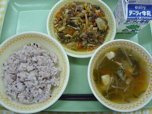 雑穀ご飯 牛乳 チンゲン菜のスープ 青椒肉絲牛