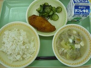 麦ご飯 牛乳 豚汁 あじフライ きゅうりの塩こんぶ和え