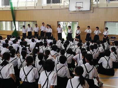 本日5校時、体育大会の結団式を行いました。生徒の進行で、団編成、団色決定、団長、副団長、団顧問の挨拶等がありました。3年生にとっては最後の体育大会。その体育大会への第一歩となる結団式は、生徒全員の気持ちが一つになった、熱く笑顔溢れるものとなりました。