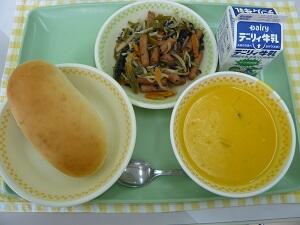 チーズパン 牛乳 かぼちゃのポタージュ ウインナーと野菜のソテー