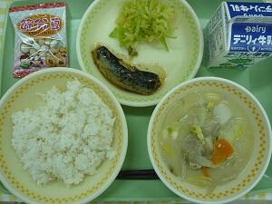 麦ご飯 牛乳 豚汁 いわしの梅煮 キャベツのごま和え 節分豆