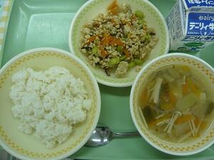 麦ご飯 牛乳 中華スープ 鶏そぼろ丼