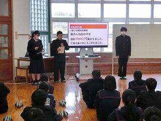 です。募金をしてくださった生徒、保護者、先生方ありがとうございました。この善意の気持ちが、八代中
