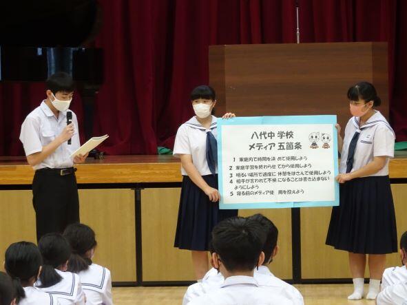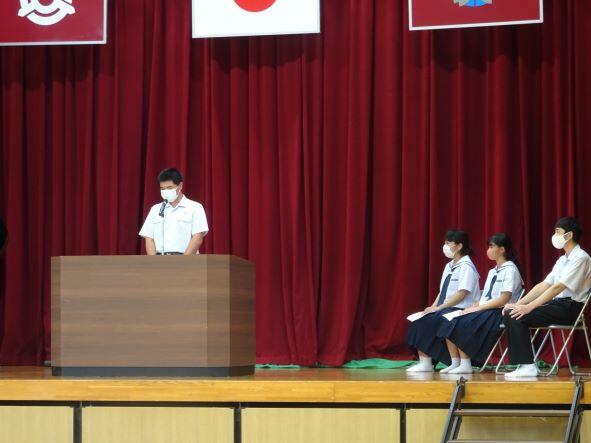 1学期の終業式で中村さん、伏田さん、川口君、山岡君が反省と2学期の抱負を発表してくれました。また、後半に、生徒会が新しく作ったメディア5ヶ条を発表し、全員で唱和しました。しっかり実行してください。