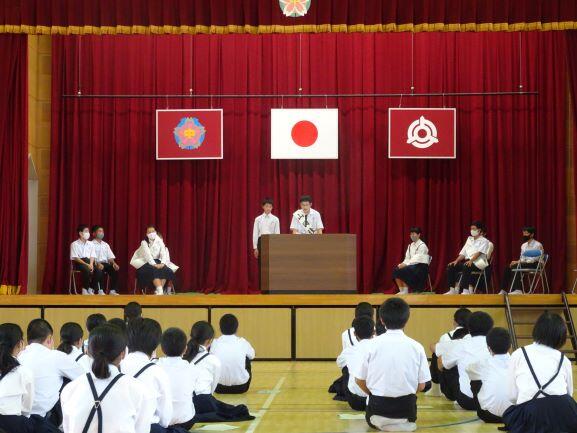 学習委員長:西田杏花さん、副委員長:鍋島さくらさん。生活美化委員長:花井翼君、副委員長:中別府萌名さん。給食保体委員長:長嶺彩加さん、副委員長:緒方壮磨君です。