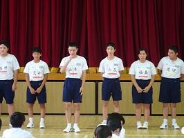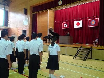7月22日に1学期の終業の日を迎えました。この日は2時間授業を行ったあとに、終業式と学級活動が行われました。終業式では各学年と生徒会の代表が1学期を振り返っての感想を述べてくれました。式後には生徒会から1学期のボランティア活動優秀者の表彰もありました。最後に夏休みの心構えとして健康面、学習面、生活面の話が担当の先生方から行われました。
