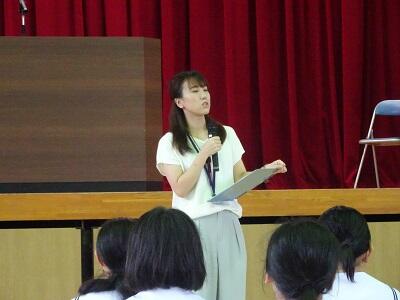 8月1日の登校日の日に【平和教育集会】を実施しました。8月は広島、長崎への原爆投下や終戦記念日など、日本人として忘れてはならない日を前にして、今の時代を生きる中で「平和」とはいかにあるべきかを体験者の話を通して考えて欲しいと思い計画したものです。当日は宮崎市の那須道子さんや県遺族連合会、国富町遺族会会長に来て頂き、那須さんの戦争体験の話をして頂きました。今の「平和」について子どもたちが何かを感じ取ってくれたら良いなと思っています。