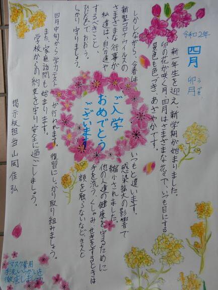 校門前の掲示板の在校生から新入生へのメッセージです。先輩から後輩へ様々な気遣いがうかがえます。