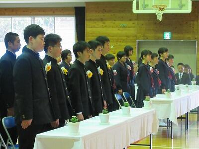 卒業生32名(男子20名、女子12名)一人ひとりに卒業証書が渡され、卒業生は「はばたこう明日へ」、全校生徒で「旅立ちの日に」を合唱しました。会場に響く歌声に、感動のあまり涙する生徒が多かったようです。