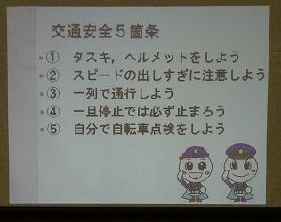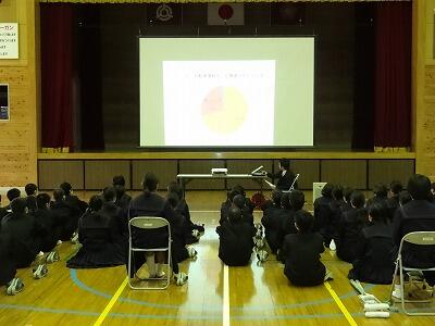 生活委員会の生徒が、自転車通行に関するアンケート結果の発表や自転車の乗り方、そして通学路の危険箇所について発表を行いました。また、交通安全への決意文を各自で書きました。