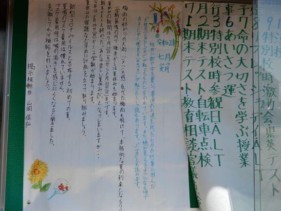 7月15日、合同帰りの会でビブリオバトルを行いました。生徒にビブリオバトルというものを知ってもらうために、今回は先生方(柿木先生、松田先生、押川教頭先生、崎田校長先生の4人)に見本を見せてもらいました。生徒達は、普段と異なる先生達の話を楽しく聞いていました。夏休みは、是非、読書をしてください。