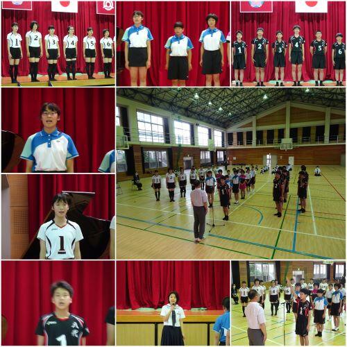 この日、各部のキャプテン(日髙大地君(男子バレー)、佐村妃菜(女子バレー)、徳満友希菜(ソフトテニス))と水泳競技に出場する花井翼君が大会にかける意気込みを述べてくれました。生徒会の盛田麗桜さんからの激励の言葉を受け、全力で試合に臨んでくれることでしょう。