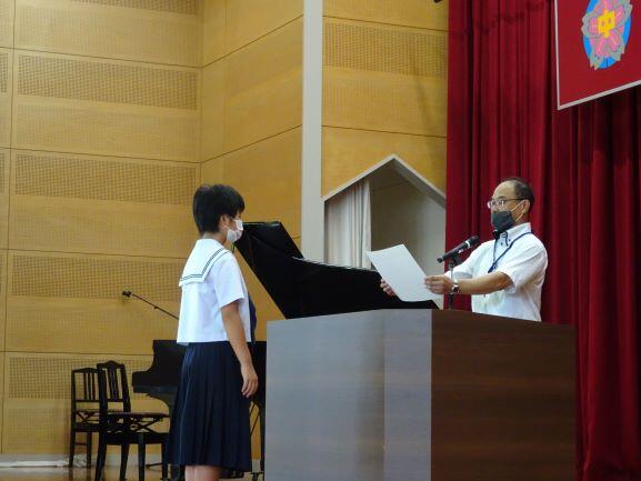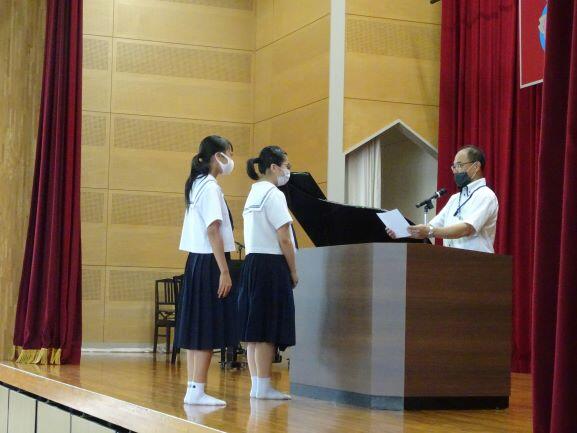 始業式の後に国富町短歌大会に入賞した地田侑多さん(1年)と体力測定で優秀な成績を出した萱島美羽さん(3年)・岡田心来さん(1年)の表彰をしました。おめでとうございます。