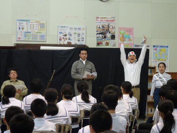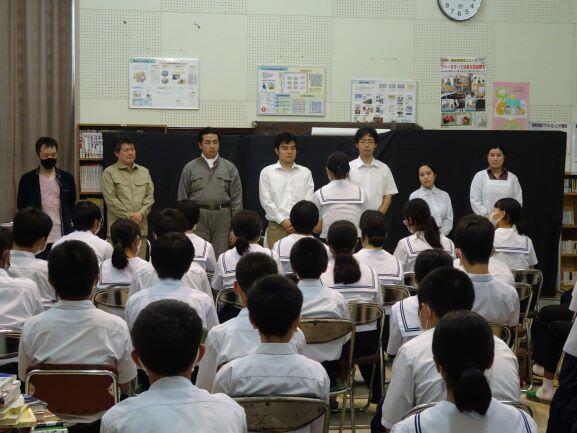 始業の日の午後、サラみやざきの方々をお呼びして、延岡を舞台にした特効兵の朗読劇を上演して頂きました。先の大戦の経験者が少なくなり、戦争の悲惨さを知る機会がない中学生に大変貴重な時間になりました。