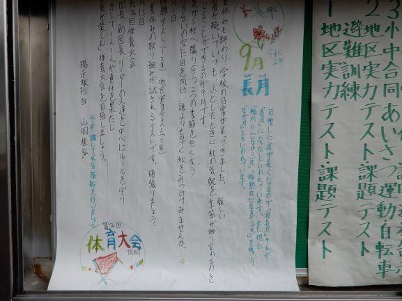 生徒玄関前の掲示板に山岡君が9月の行事予定とその心構えについて書いたポスターを貼ってくれました。9月13日(日)の体育大会をみんなで成功させましょう。
