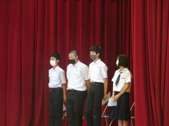 始業式が行われました。1年 大野君、2年 佐藤君、3年 河野君、生徒会 中別府さん が2学期の抱負を発表してくれました。2学期は体育大会をはじめ、重要な行事がたくさん行われます。積極的に参加して飛躍の学期にしてください。