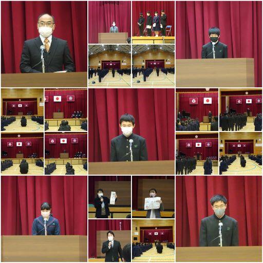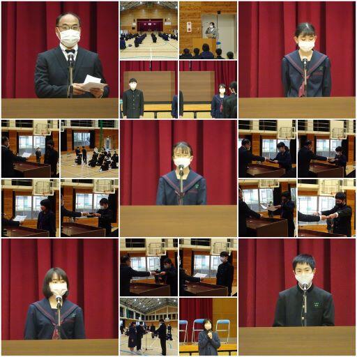 1年茂田君、2年中馬君、3年河野さん、生徒会代表緒方君が新年の抱負を発表してくれました。3年生はいよいよ入試を迎えます。2年生は最上級生に、1年生は、後輩をむかえる年になります。自分の目標に向かって努力していってください。