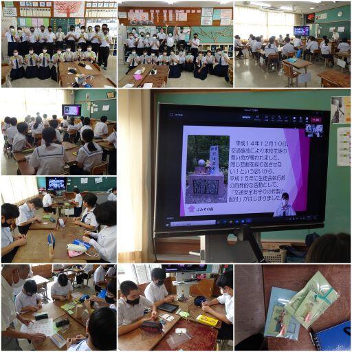 コロナ禍ということもあって、ZOOMで小学校と中学校をつないで、作り方の説明を中学生が行い、その後、制作作業を行いました。作ったお守りは、家庭に持ち帰って保護者の方にお渡しすることになります。皆さん、安全運転を心がけましょう。