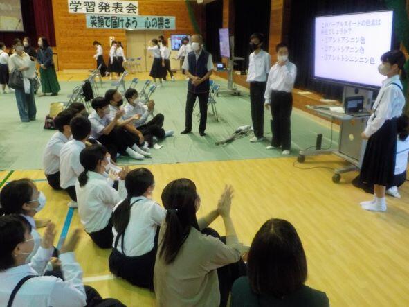 総合的な学習の成果発表を各学年で行いました。1年生は芋の栽培、2年生は職場体験学習、3年生は福祉体験についてプレゼンテーションや実演などを交えて発表してくれました。短い準備期間でしたが、よくまとめられた良い発表でした。