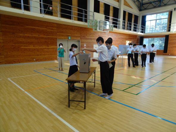 1年生の和田君、2年生の有村さん、西田君、原口さんが力強く公約を述べてくれました。演説会の後、投票を行いました。結果は後日発表されます。立候補した4人と応援演説の人、そして選挙管理委員会の皆さん、ご苦労様でした。