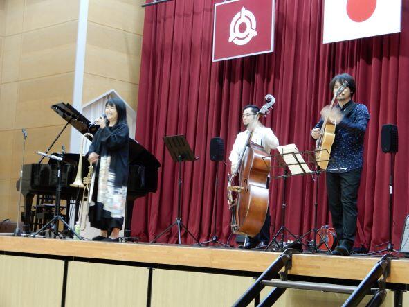 午後の学習発表会の前に鑑賞教室を開きました。香月保乃(ボーカル)さん、柳田祐輔(ギター)さん、坂元陽太(ベース)さん、浜月先生(ピアノ)の素晴らしい演奏と歌を聴かせていただきました。みんな、心を洗われた一時を過ごしました。