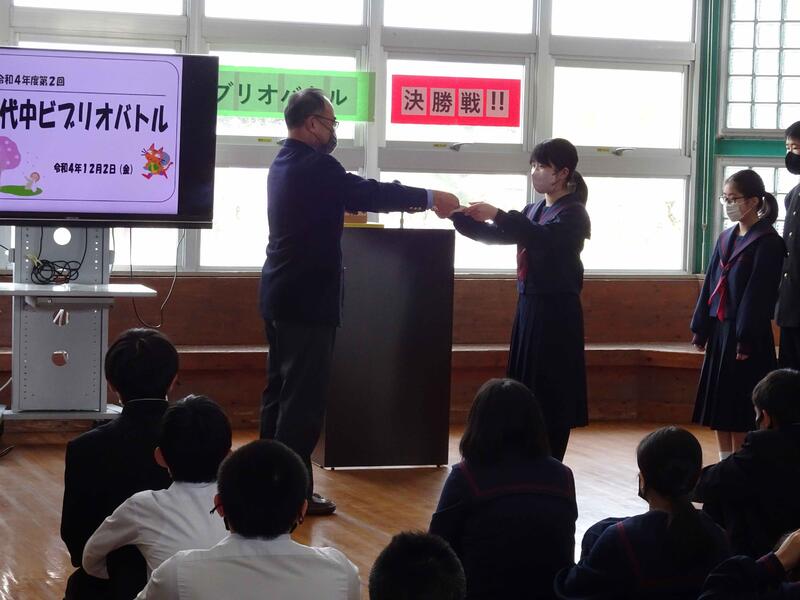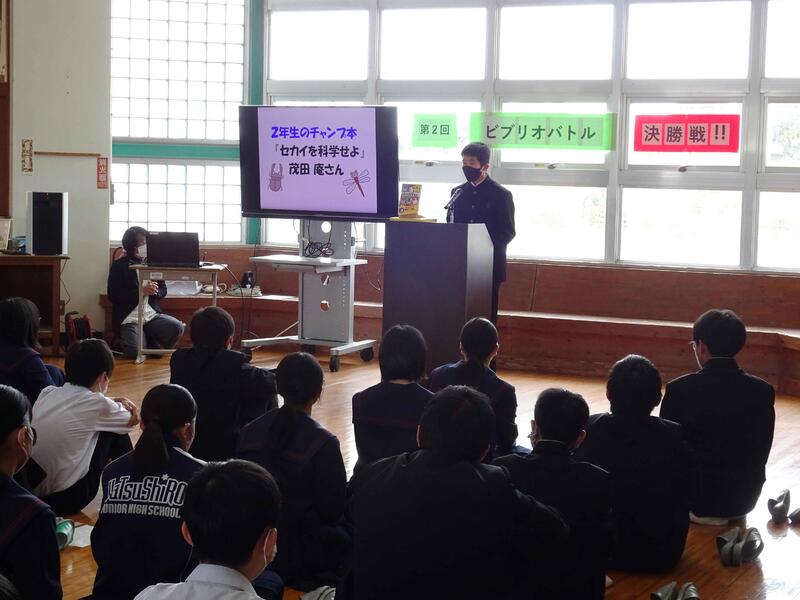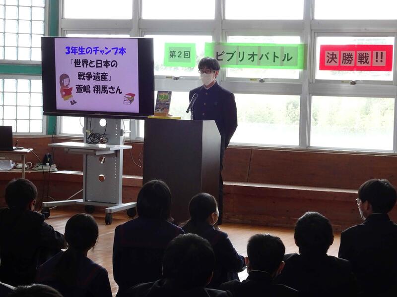 第2回ビブリオバトルを開催しました。この日は、1年鳥成さん、2年茂田君、3年萱島君が本紹介をしてくれました。3人とも、とても素晴らしい発表でした。これからも読書に親しんでください。