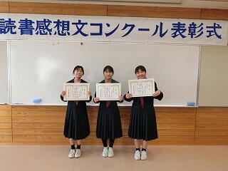 (1年:優秀賞 山岡 美空さん、2年:最優秀賞 中野 叶彩さん、3年:最優秀賞 市耒 優良さん)