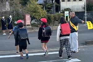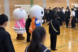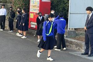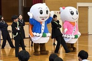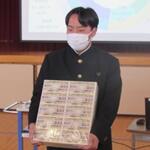 はじめに、町主催の「ぼくのわたしの交通安全標語」募集で1年の矢野萌々香さんが、みごと「お坊ちゃん 手を挙げてから 渡りなさい」が表彰され、立て看板を作ってもらいました。また、2年の大塚万由里さんの応募作品「曲がり角 見るべきものは スマホじゃない」が表彰されました。