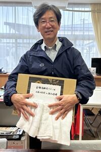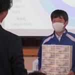 次に、サッカー部の黒木翔太くんが、先日行われた盛岡電工杯で「優秀選手賞」に選ばれ、メダルを授与されました。