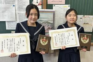 最後に、町の「読書感想文コンクール」において、1年の湯村恋菜さんが「最優秀賞」、2年の大塚万由里さんが「優秀賞」を受賞しました。