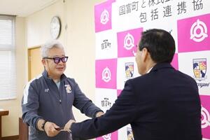 同日、国富町役場では、中別府尚文町長とテゲバジャーロ宮崎の石原実会長が協定書に署名しました。
