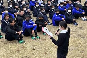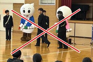 11/24(金)、新生徒会役員主催の第1回の「生徒集会」が開かれました。今回は、あいさつ(「愛」拶)を盛り上げようと、役場から国富町ゆるキャラの「しらたマン」「しらたまちゃん」が来てくれて、楽しくあいさつの仕方を学びました。