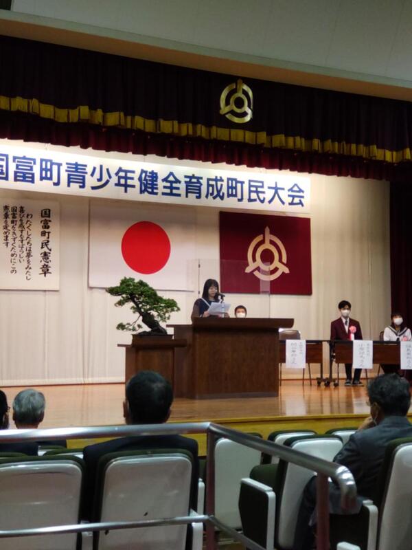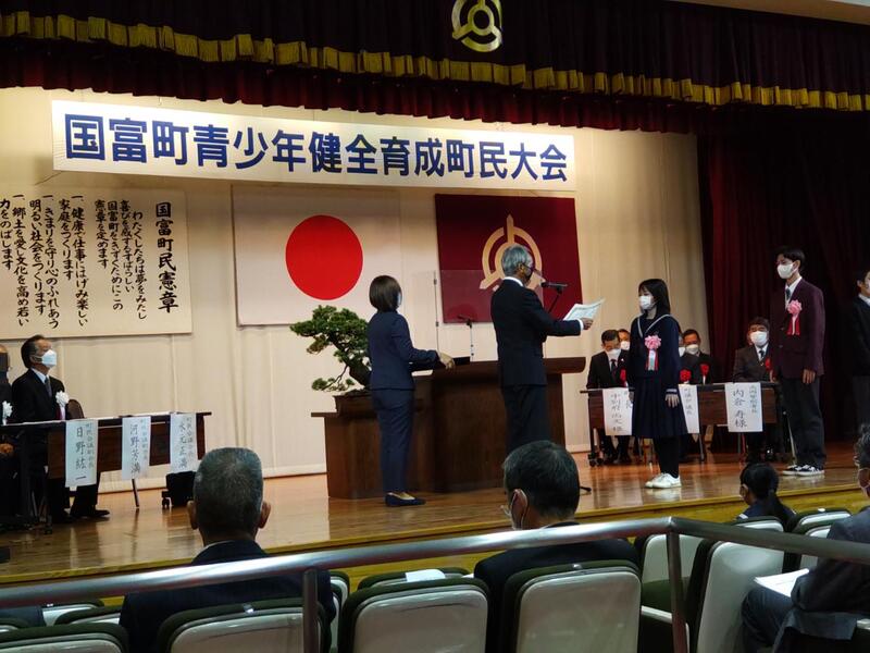 12月4日(日)に、国富町農村環境改善センターで「第28回 国富町青少年健全育成町民大会」が開催されました。大会では、青少年健全育成作文コンクールの最優秀賞受賞者の表彰と作文発表がありました。中学生の部では、本校3年生の 関谷 華鈴 さんが代表として発表をしました。「感情を聞く」という題で、関谷さんが本を読んでいるときに心に残った「感情を聞く」という言葉について、自身の体験したエピソードを交えて、人と人とのコミュニケーションの在り方やよりよい人間関係づくりで大切なことを発表してくれました。