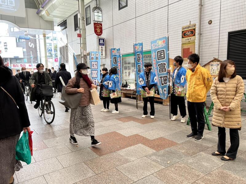 今日は、大阪御堂筋橋2丁目商店街で「国富町PR大作戦」。JA宮﨑中央から提供していただいた「せんぎり大根」と「国富町の名所を載せたリーフレット」「せんぎり大根料理のレシピ」を、街ゆく人にプレゼント。自分たちでつくったCMソングにのせて、大阪の方々に勇気を出して声をかけました。大阪の方々に、国富町の魅力をハッシン!!