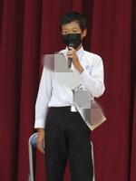 今回は、会長のあいさつに続いて、「気持ちよいあいさつの見本」を3名が「寸劇」?仕立てで披露してくれました。また、明日、「東諸・高岡地区安全で安心なまちづくり推進大会」の第1部の式典で「意見発表」する3年B組の原田晄杜くんが、リハーサルを兼ねて全校生徒の前で発表しました。